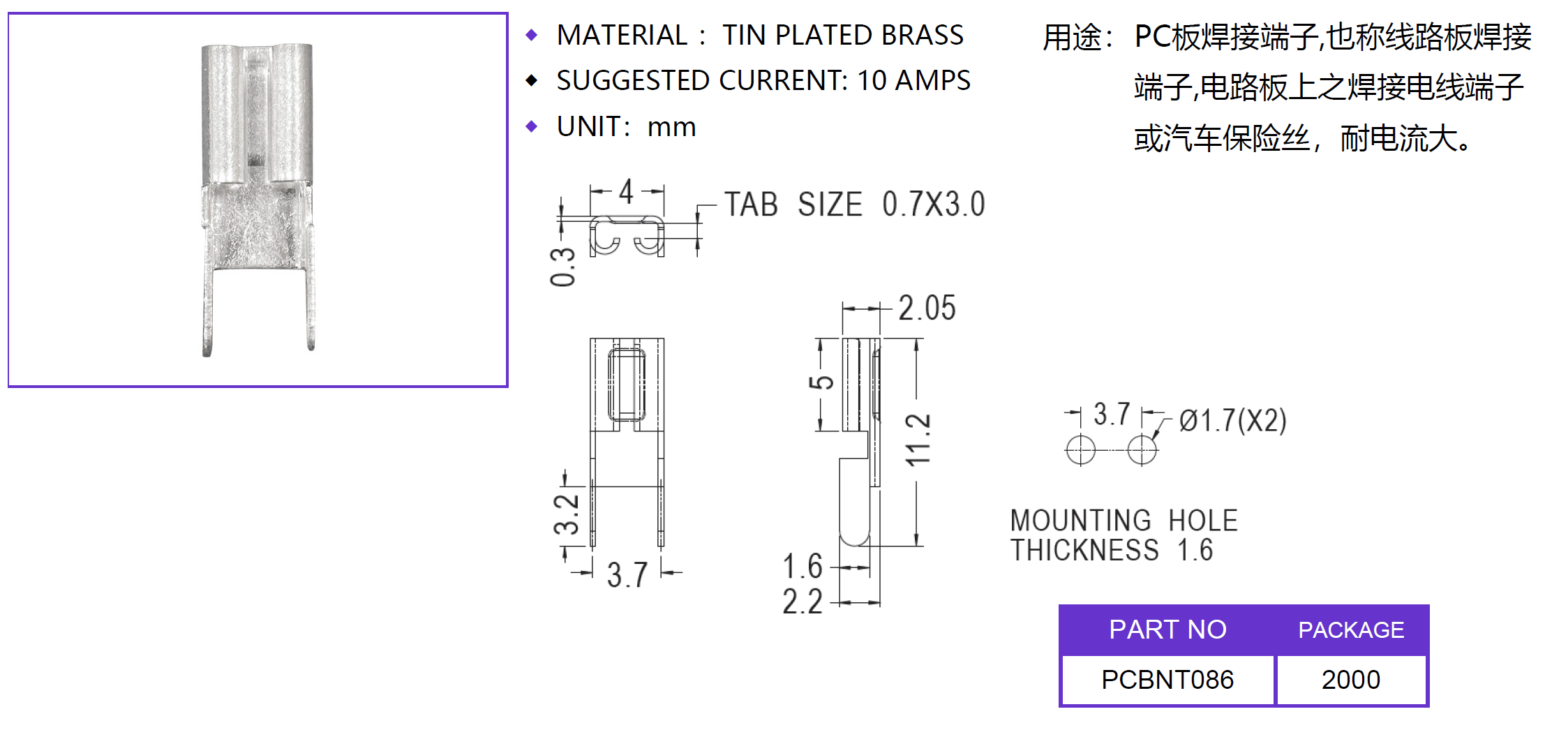 電路板上之焊接電線端子或汽車保險絲,耐電流大。